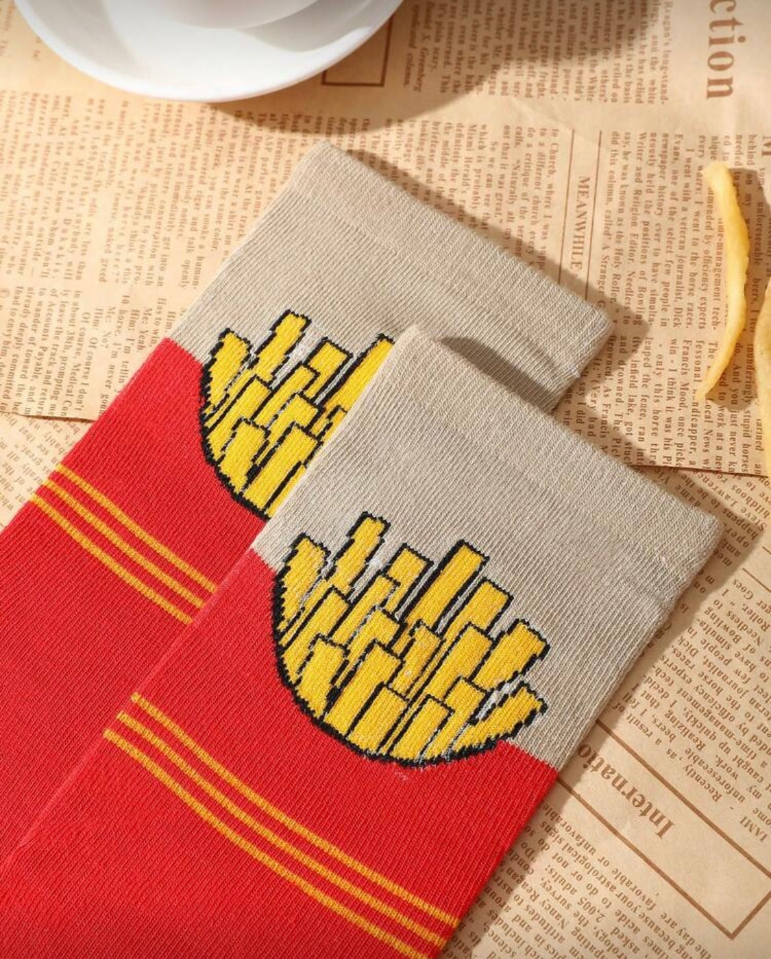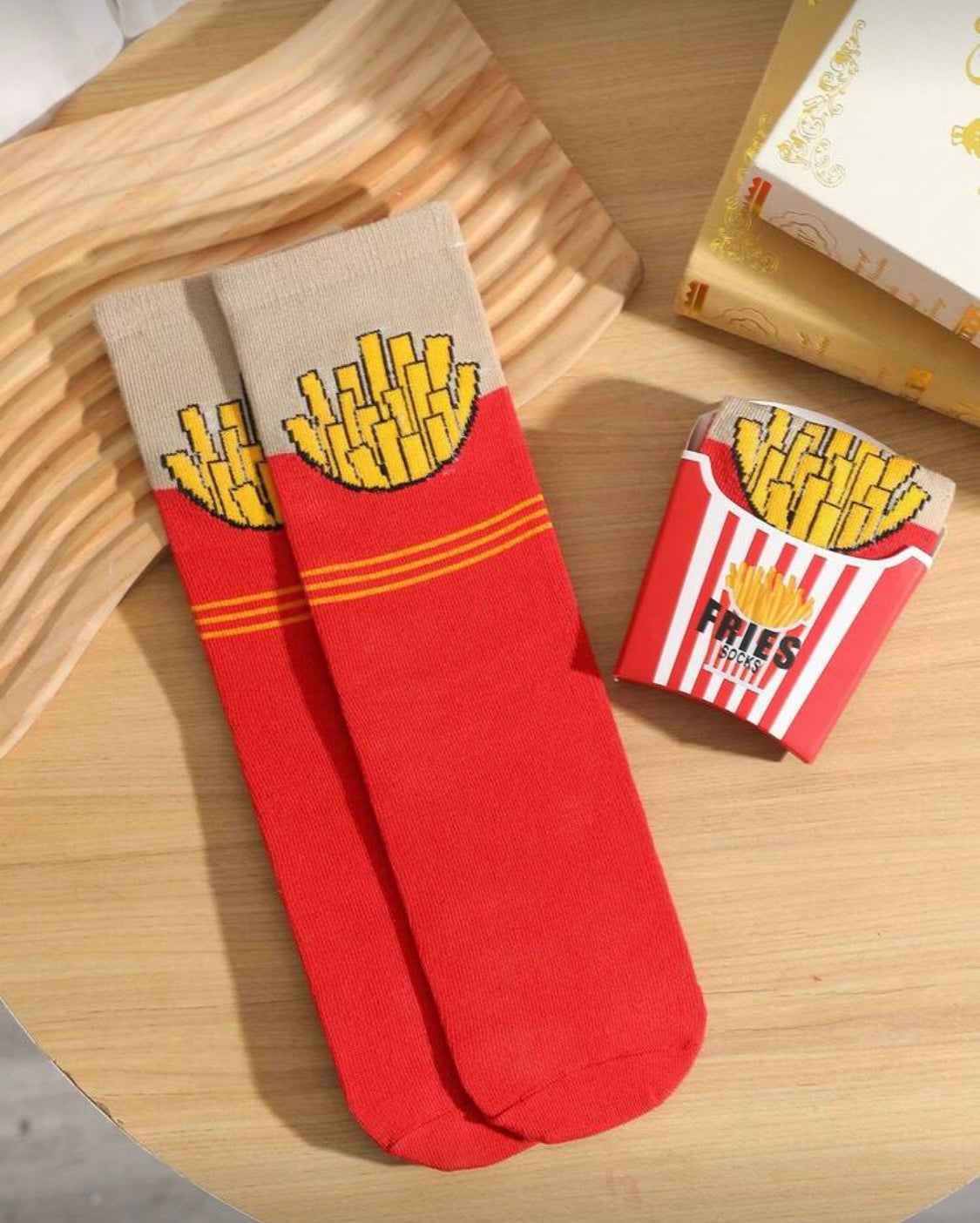Este combo incluye calcetines inspirados en hamburguesa, papas fritas y cerveza, presentados en sus icónicos envases tipo fast food. No es comida (lamentablemente), pero sí es el outfit perfecto para quienes aman el buen humor, los detalles creativos y los regalos originales.