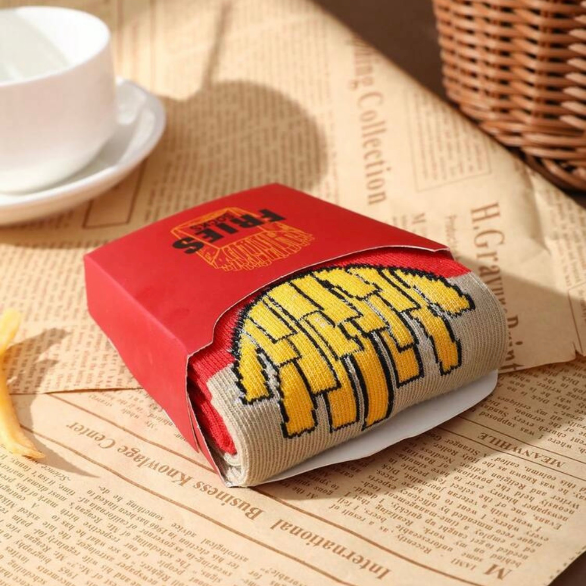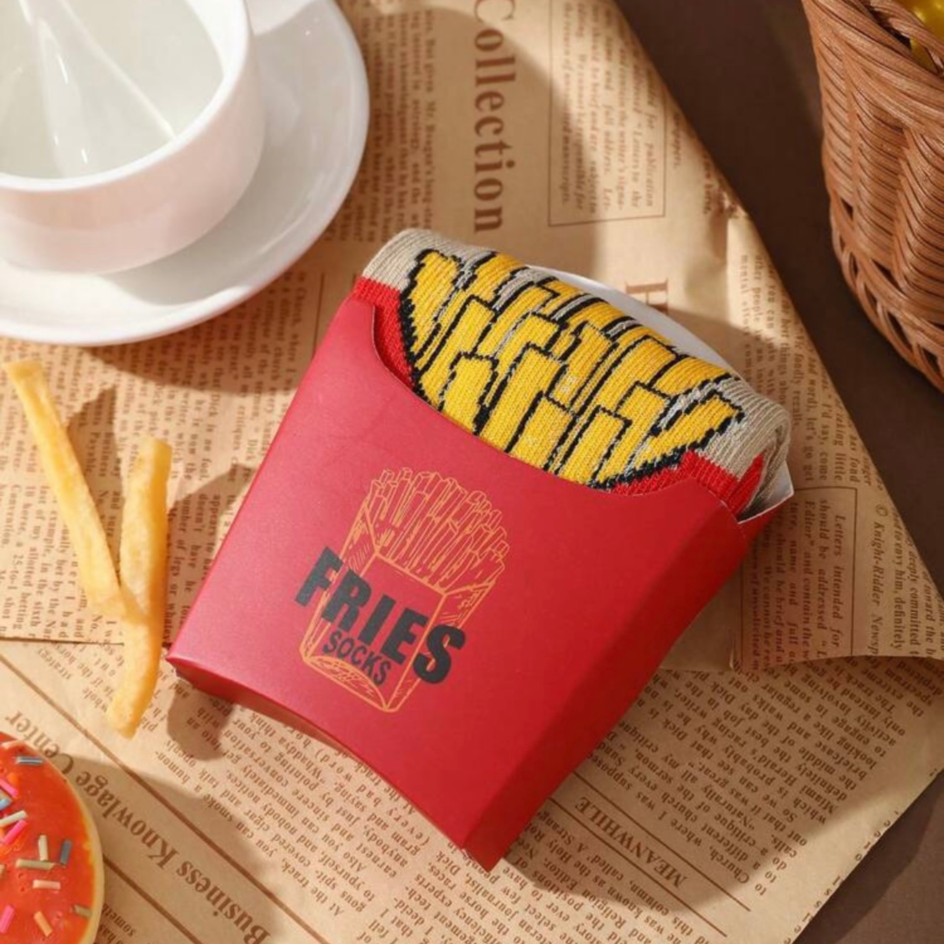 1 par de calcetines de media caña multicolor con diseño de patatas fritas, en caja de regalo.